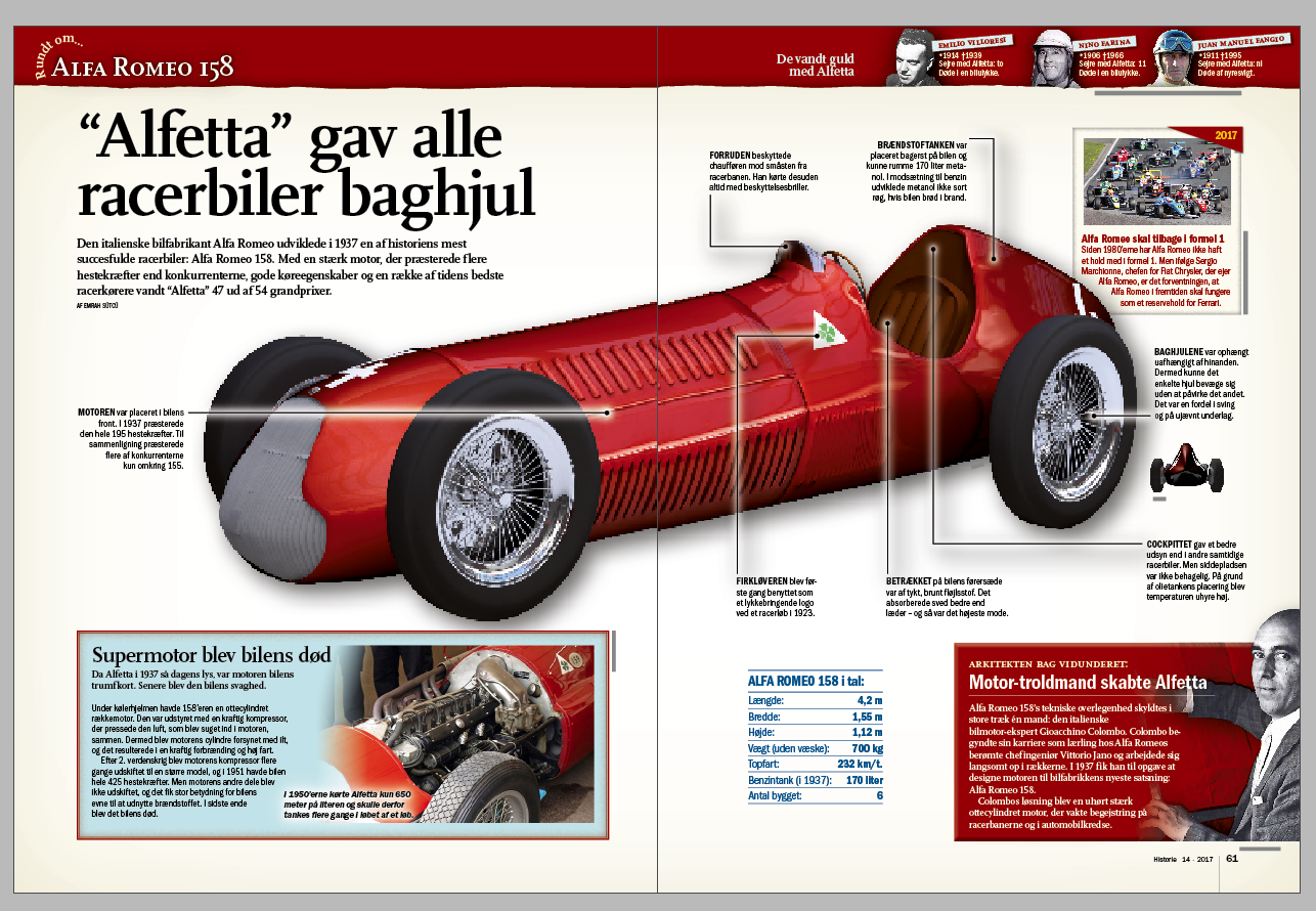 In its graphic section Rundt om… (About…), Illustreret Videnskab Historie magazine also has space for historical sporting events, as evidenced by the inclusion of the Alfa Romeo 158, popularly called "Alfetta", a racing car with exceptional performance, which, driven by the Italian Nino Farina and by the Argentine Juan Manuel Fangio, won 47 of the 54 grand prixs in which it participated. The attractive vehicle design and the rear view section were the only elements used from the original infographic.
