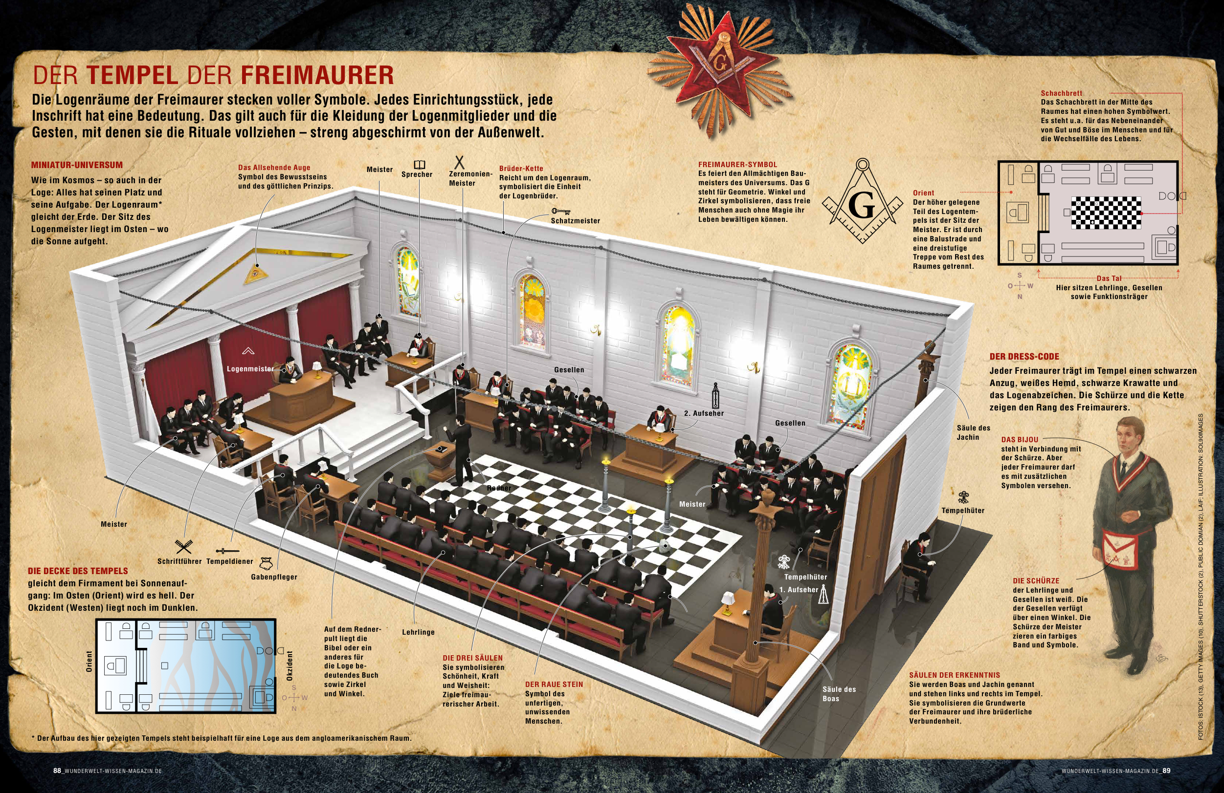 The Freemason temple, with its symbolism and the functions of its members, was the central infographic of the article that Wunderwelt Wissen Magazin dedicated to this secret society that, founded in the late XVII and early XVIII centuries, which had its golden age in the XIX century.