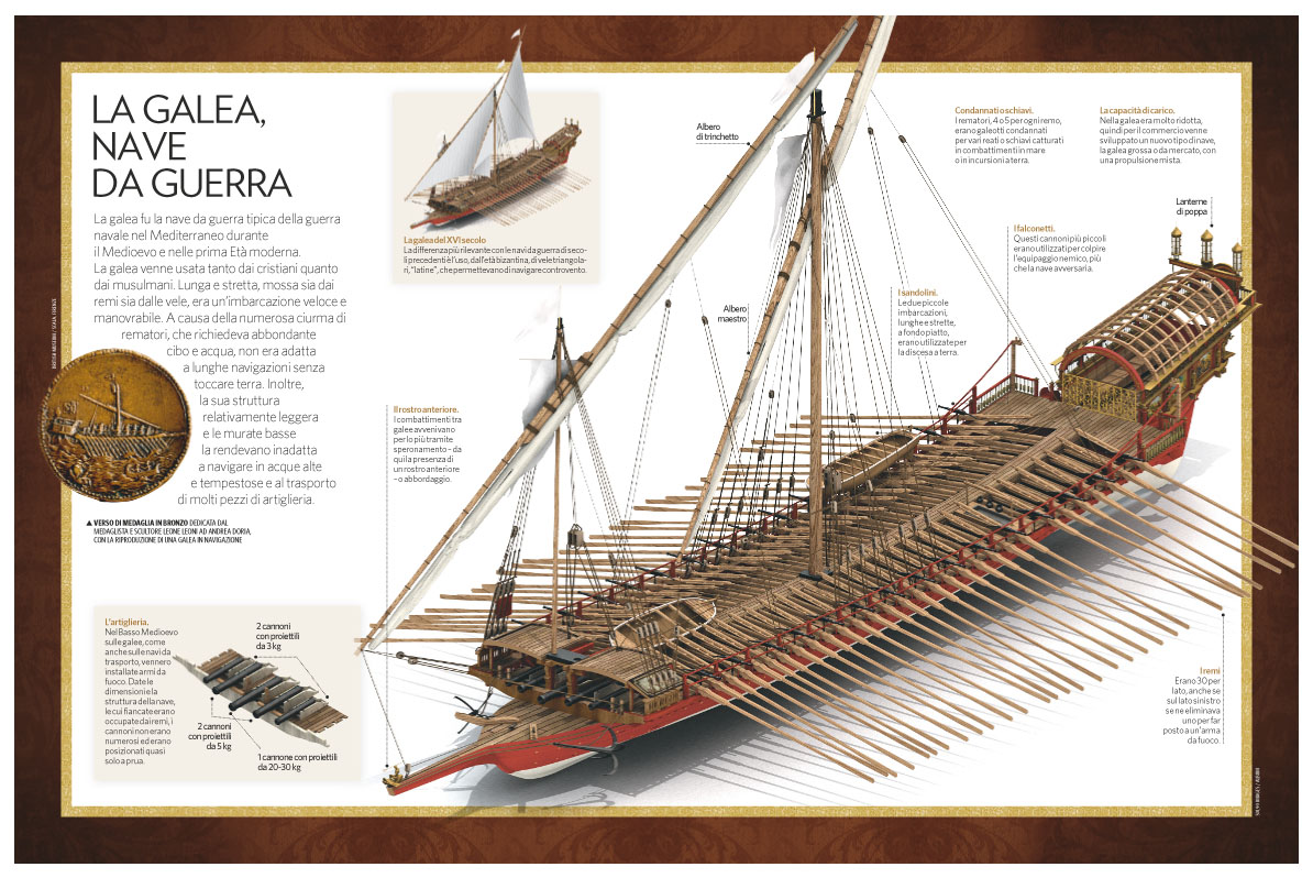 Storica National Geographic, the Italian edition of the popular North American magazine, dedicated a report to the Battle of Lepanto, between the Christian and Ottoman fleets. As would happen later in the Spanish edition, the information included on double-page, the infographic of Don Juan de Austria's Galley “La Real”, whose elements were arranged at the criteria of the magazine's editors. After the conquest of Cyprus by the Otomans, which was domain of the Republic of Venice, the Holy League was organized, made up by the Spanish Empire, the Papal States, the Republics of Genoa and Venice, the Duchy of Savoy and the Order of Malta, in order to stop the Turkish advance in the eastern Mediterranean. The commander of the Christian fleet was Don Juan de Austria, brother of King Felipe II of Spain. The naval battle took place on October 7th 1571 in the waters of the Corinthian Gulf, in front of the city of Lepanto, on the western coast of Greece. The Christian fleet got the victory against an enemy greater in number.