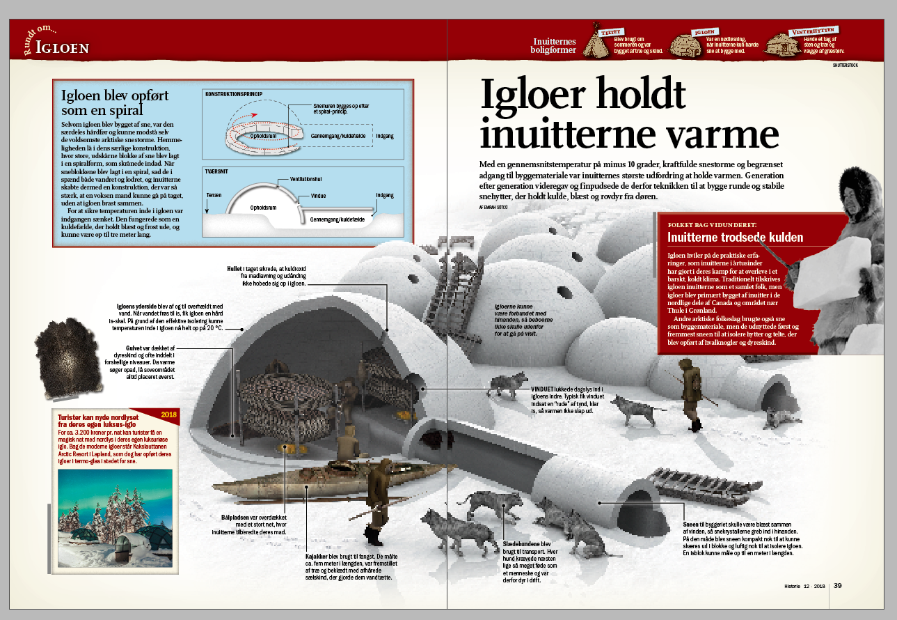 There is no doubt that the Inuit (or Eskimo) people constitute an exceptional model of adaptation to the most extreme climatic conditions. The igloo is one of the key pieces of their survival and their triumph over the Arctic ice. The Illustreret Videnskab Historie magazine, published in Denmark (where Greenland, home to a large Inuit community, is a government agency), chose the infographic of Infographics90 to illustrate the theme of the Inuit's ice dwellings in Rundt om... (About...), a fixed graphic section of this historical publication. In addition to the igloos, the graphic depicts other media typical of the Inuit community, such as kayaking and dog sledding. The peripheral pieces are contributions from the editorial staff of Illustretet Videnskab Historie.