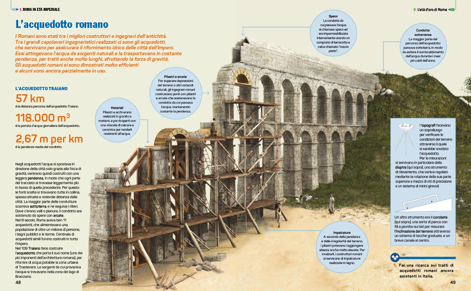The infographic of the Roman aqueduct was part of the pages that volume ITACA 2: Viaggio nella Geostoria: Dall'Impero romano all'Alto Medioevo (Journey through Geohistory: From the Roman Empire to the High Middle Ages) dedicated to Roman civilization. ITACA volumes are an innovation in the shared use of the classic book on paper, adding the advantages provided by new information technologies. Volume ITACA 2 was the continuation of volume ITACA 1: Viaggio nella Geostoria: Dalla Preistoria all'Impero romano. DeA Scuola completed the image dedicated to the Roman engineering work, with the characteristics of the Trajan aqueduct, which is the longest of the eleven that in the 2nd century supplied water to the capital of the empire; DeA Scuola also included other elements unrelated to the original infographic.