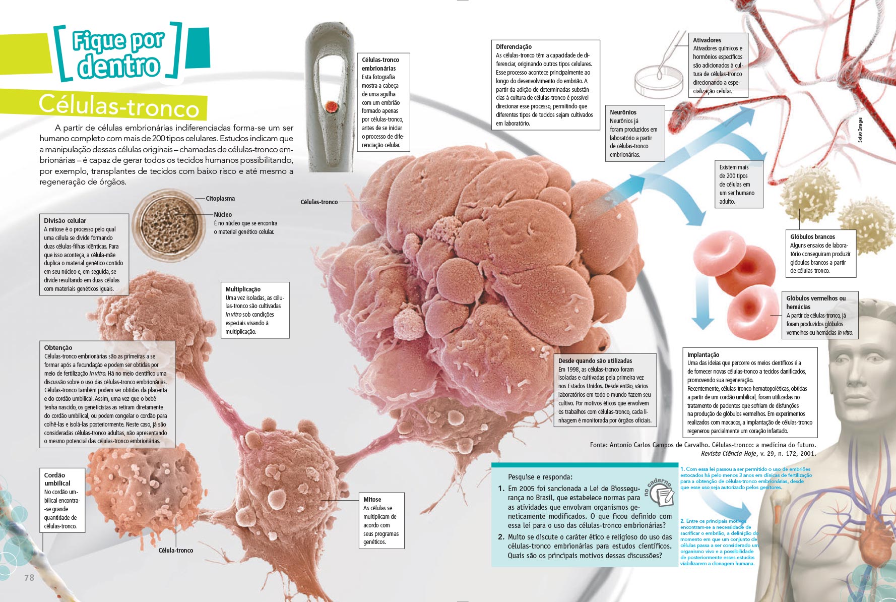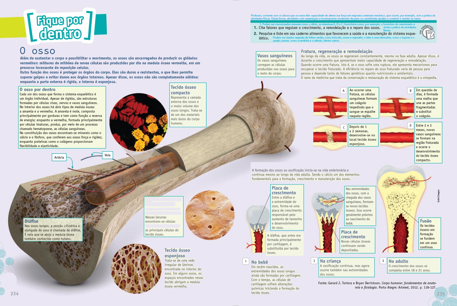 The book Tempo de Ciências (Science Time) of the eighth year of Basic Education II, reproduced the infographics: Células-tronco (Stem cells) and O osso (The bone). The style and layout of the text in the original infographics and some graphic elements, were modified and removed in favor of Editora do Brasil's needs. The two images included references to the publication from a specialist in the field.