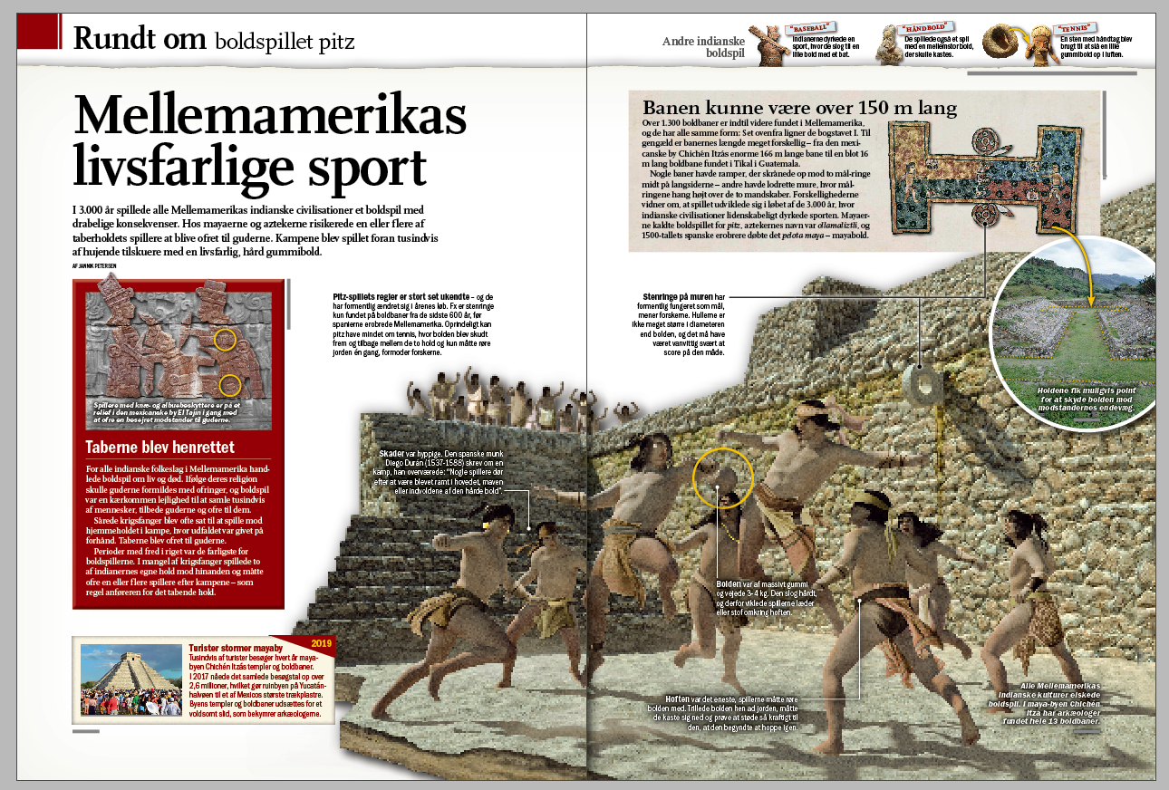 The peoples of Mesoamerica had in common the practice of ball game, whose origins date back to 1400 BC. This vigorous sport, played by two rival teams, was represented by the Danish history magazine Illustreret Videnskab Historie with a central infographic by Infographics90. As is customary in the Danish publication, the peripheral images — a relief representing the sacrifice of a ball player on a court in El Tajín, Mexico, a drawing and photograph of the playing field, figurines representing other Mesoamerican sporting practices, and a current note from 2019 — were produced by the magazine itself. The sheet appeared in the pages of Rundt om... (All about...), a regular section. The ball game was played with a rubber ball. According to all indications, when the game was held on the occasion of a religious celebration, the losers were sacrificed to the divinity.