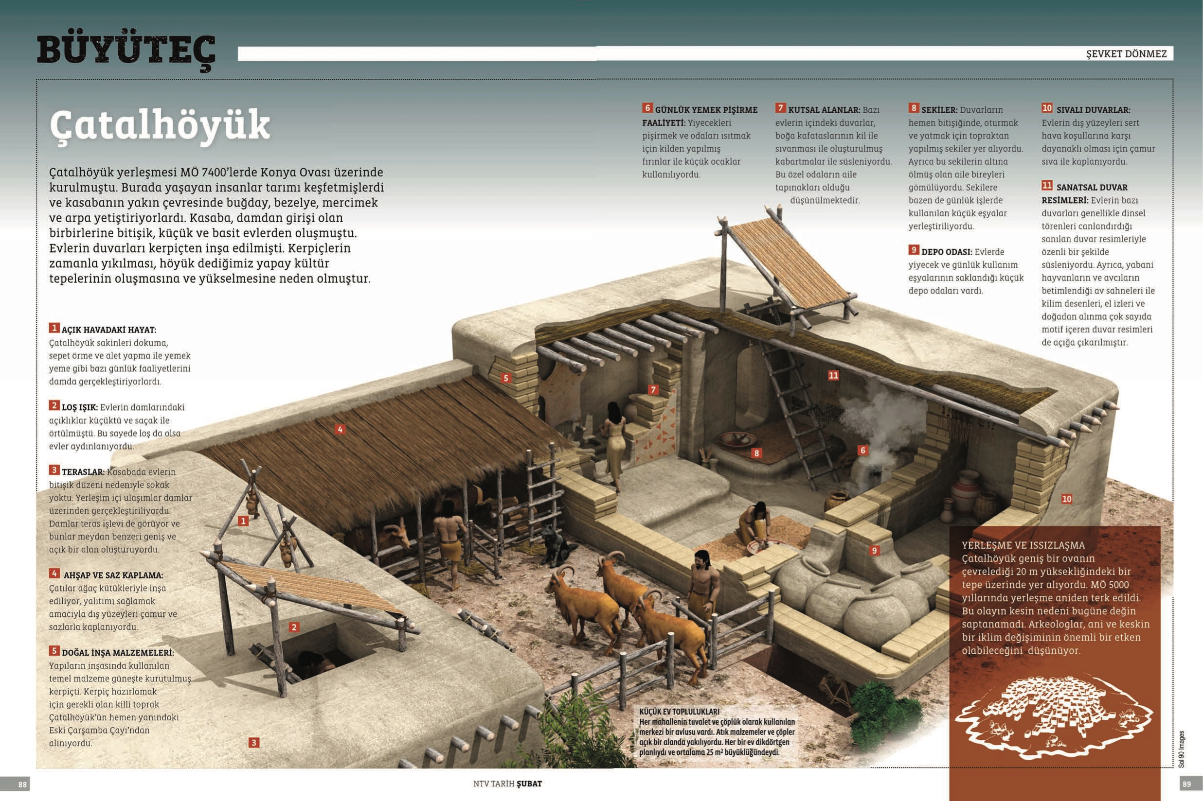 Antes de su cierre en 2013, el prestigioso semanario de historia turco NTV Tarih, ligado al conglomerado Dogus Media Group, escogió esta infografía de Çatal Hüyük, uno de los yacimientos neolíticos más importantes del mundo, para su sección Büyüteç (Con lupa). Situado al sureste de la actual Turquía, Çatal Hüyük constituye uno de las más antiguos modelos de transición del sedentarismo a las sociedades urbanas. Ocupado durante más de 2.000 años, el yacimiento conserva restos que van del 7400 al 5200 a. C., desde el Neolítico al Calcolítico. En 21012, la Unesco lo declaró Patrimonio de la Humanidad.