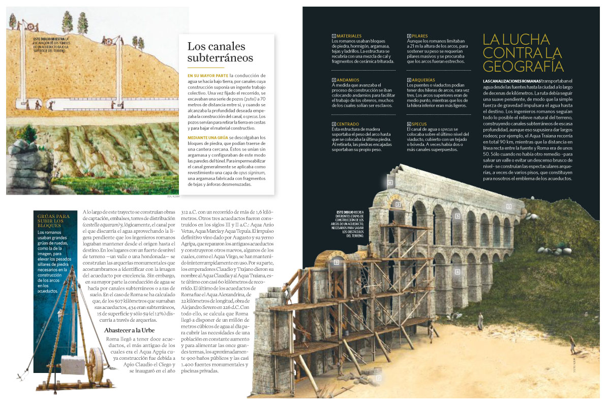La infografía del acueducto romano presidió el reportaje dedicado por National Geographic Historia a estas infraestructuras hidráulicas y titulado Los acueductos, orgullo de Roma. Además de calzadas y puentes, los acueductos figuran entre las obras de ingeniería más abundantes y espectaculares del ingenio romano y de la Antigüedad. Antes del siglo I de la era cristiana, Roma, la capital del imperio, por ejemplo, estaba abastecida de agua constantemente por siete acueductos diferentes. El más corto medía 16,5 km, y el más largo tenía una longitud de casi 91,5 km. En el siglo III d. C. llegó a tener en servicio once acueductos. El trazado de la mayoría era subterráneo. No obstante, para vencer los grandes desniveles se construían arquerías como las de los acueductos de Segovia, Mérida y Tarragona, en España, y el de Nimes (Pont du Gard), en Francia, declarados Patrimonio de la Humanidad por la Unesco.