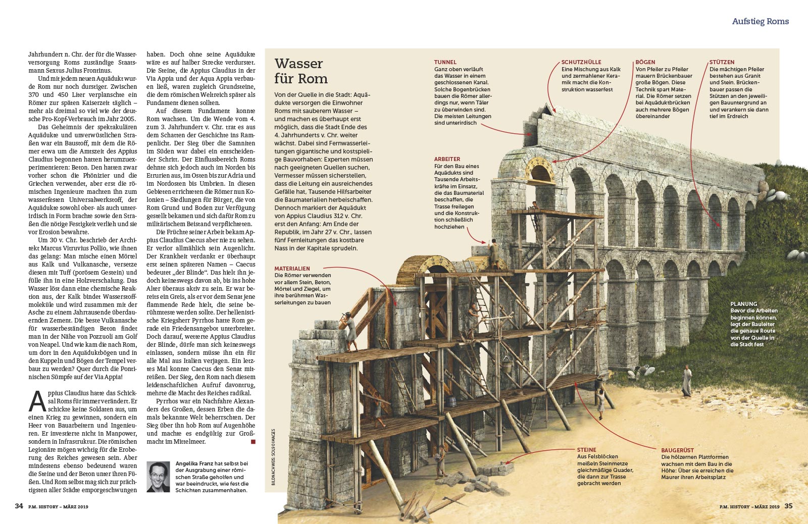 La infografía de la construcción del acueducto romano es una de las más solicitadas. Por su calidad y detalle ha sido elegida por muchas de revistas de divulgación histórica para ilustrar la ingeniería de la Antigüedad o la civilización romana. En esta ocasión ponía el punto y final a un reportaje de la revista P.M. History, titulado Auf Beton gebaut (Hecho de hormigón), sobre la ingeniería civil romana. Wasser für Rom (Agua para Roma) era el título del texto que acompañaba a la imagen del acueducto. La infografía muestra la construcción de un puente de doble arquería para un acueducto, inspirado en el de la ciudad española de Segovia, declarado Patrimonio de la Humanidad.