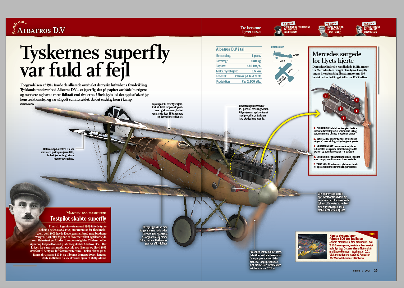 La descripción del Albatros D.V, el caza biplano que los alemanes pusieron en servicio en 1916 para contrarrestar la superioridad aérea aliada en la Primera Guerra Mundial, apareció en la sección fija Rundt om (A propósito de…) de la revista Illustreret Videnskab Historie, propiedad del grupo Bonnier Publications. De la propuesta original, los editores utilizaron las imágenes centrales: el aeroplano y el detalle del motor, además de los perfiles del aeroplano y las características técnicas del aparato. En cuanto al resto optaron por otros contenidos más acordes con sus propósitos. Tyskernes superfly var fuld af fejl (La supermáquina alemana estaba llena de defectos) fue el título de la lámina. La firma editorial danesa cuenta en su catálogo con otras tres revistas de contenidos históricos: Militär Historia, Populär Historia y Släkt Historia.