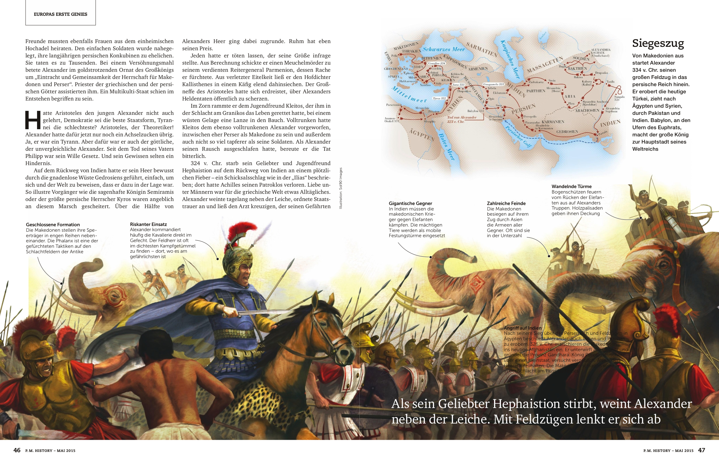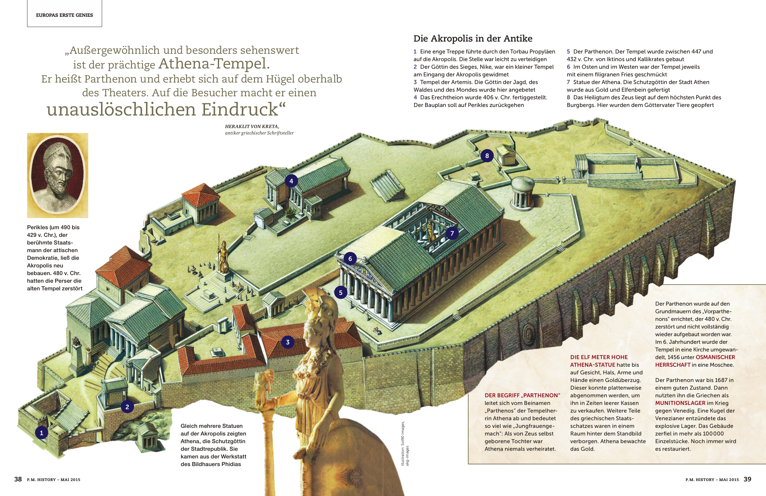 La prestigiosa revista alemana de historia P.M. History elaboró un amplio reportaje, titulado Europa Erste Genies (El pimer destello de Europa), que dedicó a la antigua civilización griega. En sus páginas utilizó dos infografías de Infographics90: La Acrópolis de Atenas y El imperio macedónico. La primera, que sirvió para ilustrar la edad de oro de la cultura griega clásica, la del siglo V a. C. o siglo de Pericles, muestra la distribución de los edificios de este recinto sagrado, construido en honor de la diosa Atenea, protectora de la ciudad: los templos de Niké y de Artemisa, el Partenón, el Erecteión, el Pandrosio, el Arreforión, el altar de Atenea, los santuarios de Zeus Polieo y Pandión y, extramuros, el Eleusinión. La segunda muestra a Alejandro Magno enfrentándose, junto a sus falanges, a los elefantes del rey Poros, a orillas del río Hydaspes hacia el año 326 a. C., cuando el conquistador macedonio emprendió su campaña contra los reinos del norte de la India.