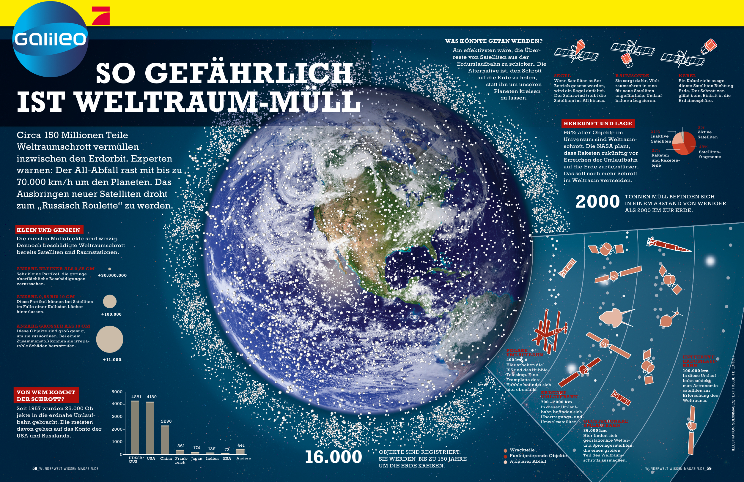 A partir de agosto de 2010, la publicación mensual alemana Wunderwelt Wissen Magazin incluyó un cuaderno especial, denominado Galileo, que ofrecía las últimas novedades en el mundo de la ciencia. En esta ocasión, bajo el título So Gefährlich ist Weltraum-müll (La peligrosa basura espacial), se reprodujo íntegramente (solamente se aplicaron las modificaciones de estilo propias de la publicación) la infografía de Infographics90. A partir de 2019, con motivo del 20 aniversario de su creación, Galileo se convirtió en una revista autónoma, de periodicidad bimestral, editada por el grupo editorial BPA, ligada aún al grupo televisivo ProSieben.