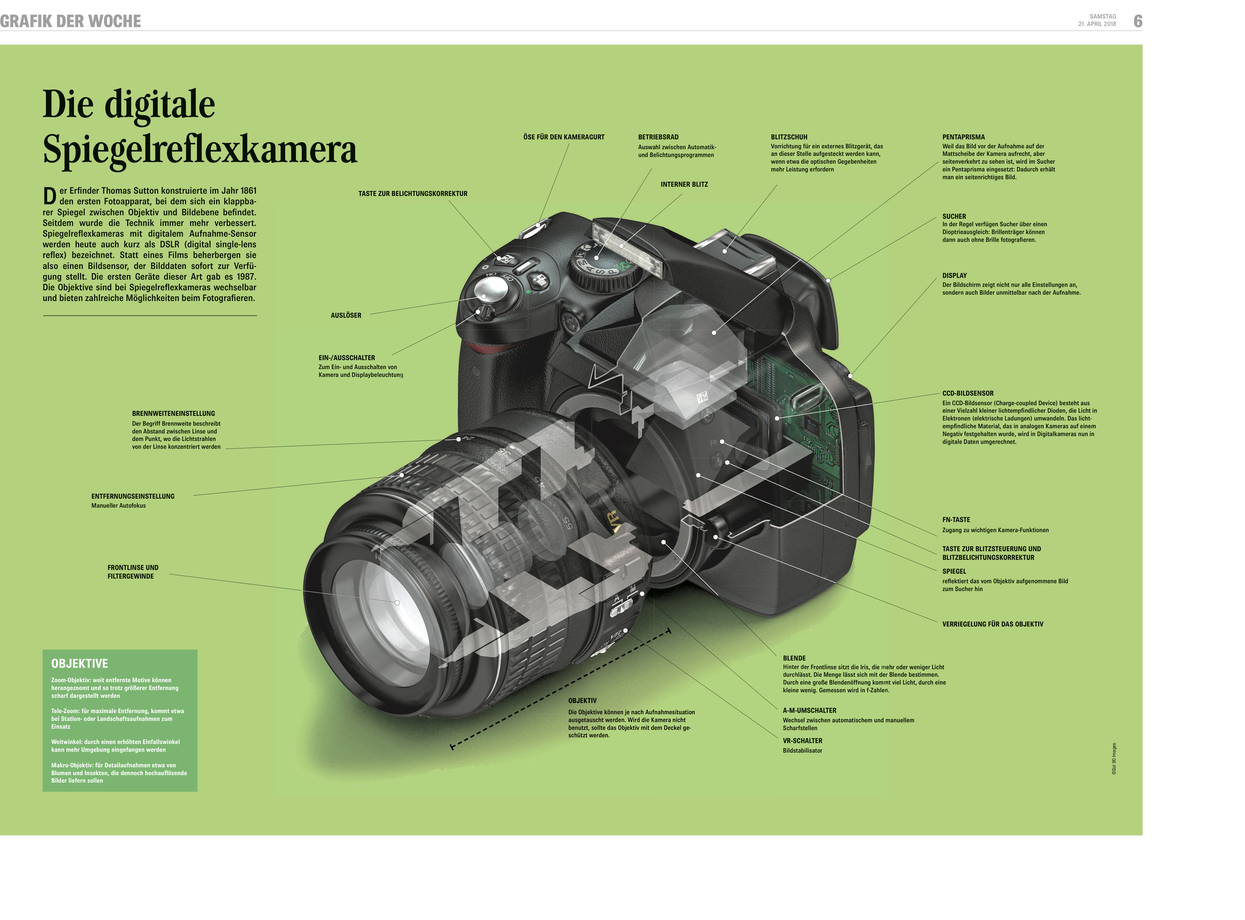 Este corte en sección de una cámara fotográfica réflex digital atrajo la atención de los editores del suplemento de los sábados del Mannheimer Morgen. La infografía fue publicada en la sección fija Grafik der Woche (Infografía de la semana) de este diario alemán, de distribución regional en Renania. Una cámara réflex es un aparato fotográfico provisto de un sistema óptico que permite al usuario ver directamente, a través del visor, la imagen que va a captar, sin desviaciones. El resultado se logra gracias a un espejo que refleja exactamente, en el visor, la imagen que se enfoca a través del objetivo.