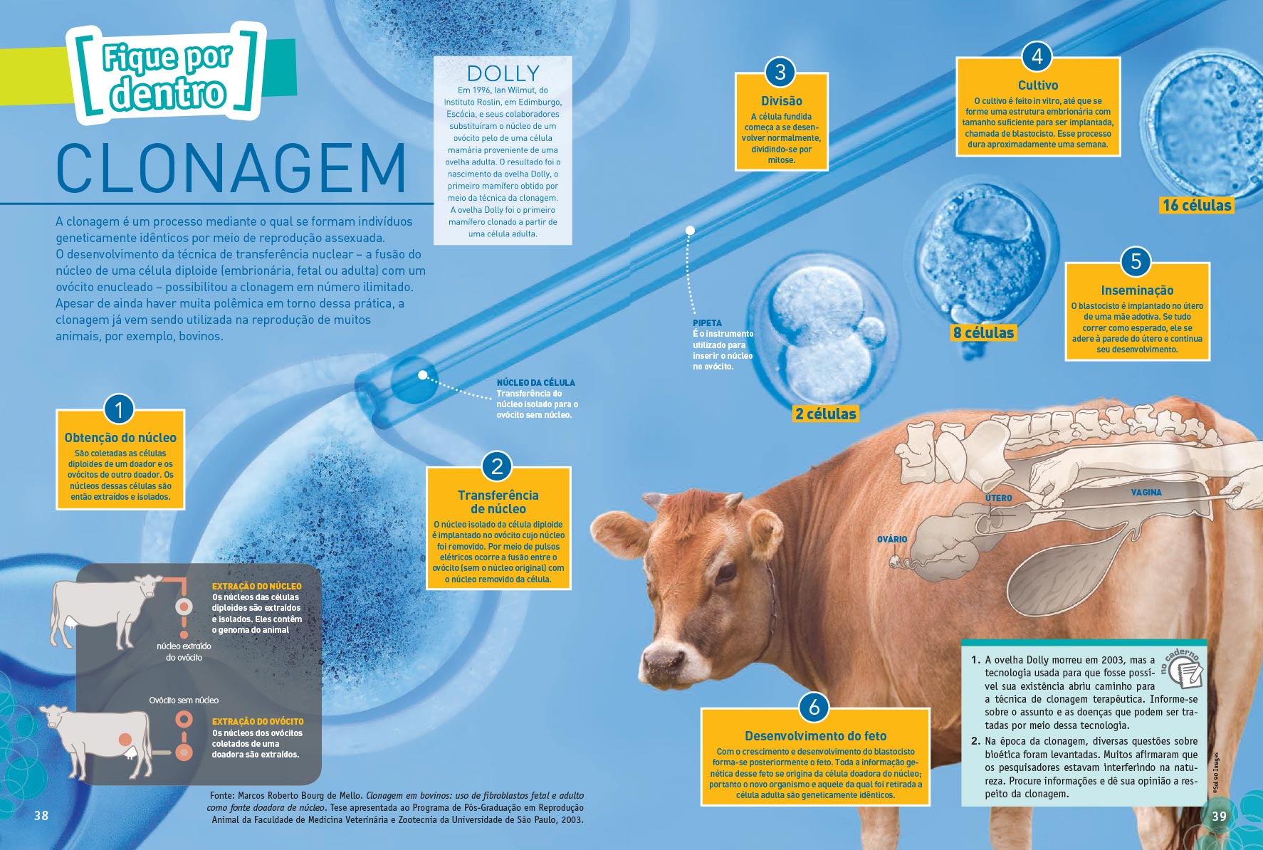 Bajo el título de Clonagem, Editora do Brasil utilizó la infografía Clonación de animales para el apartado Fique por dentro (Fíjate) del manual escolar Tempo de Ciências (Tiempo de Ciencias) de 9º año, el último de la Educación Básica II. El cliente amplió la información sobre la oveja Dolly, el primer mamífero clonado a partir de una célula adulta por un equipo de investigadores británicos, encabezados por el profesor Ian Wilmut, del Instituto Rostin, en Edimburgo.