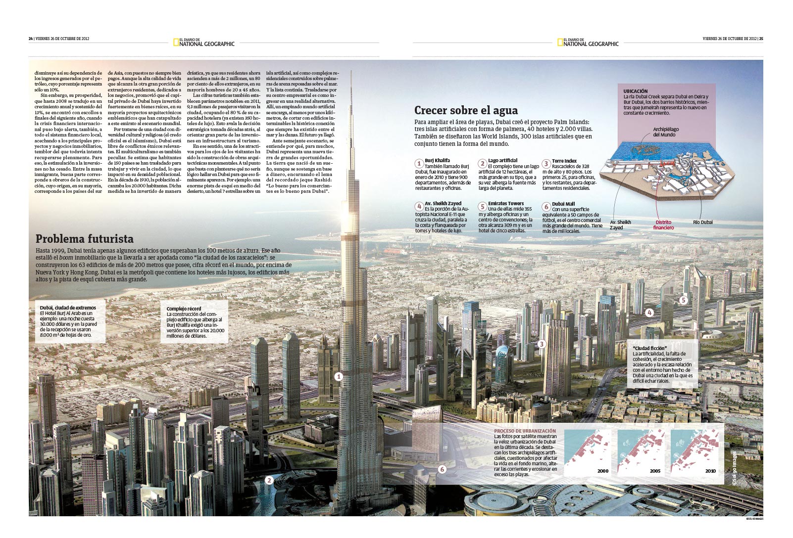 Dubái, la ciudad de los rascacielos en medio del desierto, es el tema de la impresionante infografía que cierra el reportaje La increíble Dubái: El futuro ya llegó, que El Diario de National Geographic dedicó a la innovadora capital de uno de los siete distritos de los Emiratos Árabes Unidos, convertida en una nueva meca del turismo, los negocios y la fastuosidad en el Golfo Pérsico. El Diario de National Geographic fue una iniciativa conjunta del diario argentino Clarín y la célebre revista National Geographic.