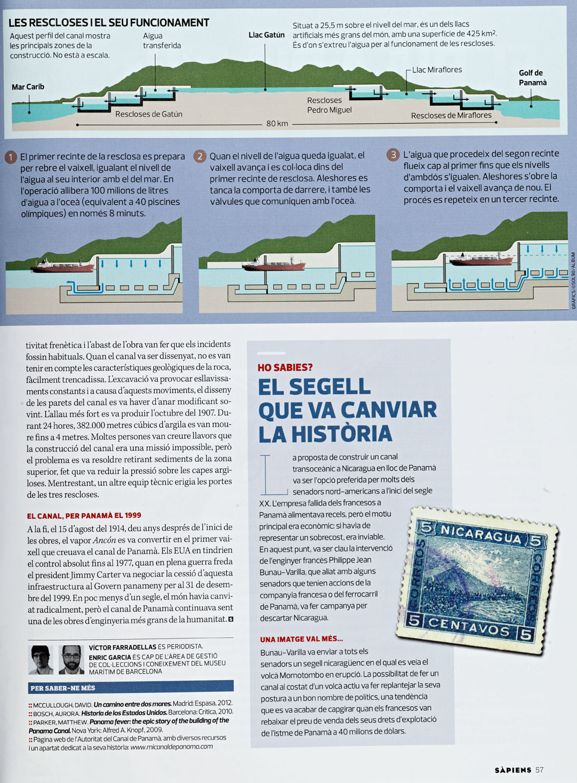 El sistema de esclusas de la infografía del canal de Panamá fue incluido por Sàpiens en el reportaje que dedicó a conmemorar el centenario de la entrada en servicio de esta vía de comunicación naval que une el mar Caribe con el océano Pacífico. El título del reportaje: La drecera americana (El atajo americano) alude a que fue Estados Unidos —bajo las presidencias de William McKinley (1897-1901), Theodore Roosevelt (1901-1909) y la primera de William Howard Taft (1909-1913)— quien dio el impulso definitivo a la construcción del canal, tras el fracaso en 1889 del ingeniero francés Ferdinand de Lesseps, constructor del canal de Suez. La infraestructura estuvo bajo el dominio de la administración estadounidense hasta el 31 de diciembre de 1999, en que Panamá recuperó la propiedad. Sàpiens es una publicación mensual de divulgación histórica editada en catalán.