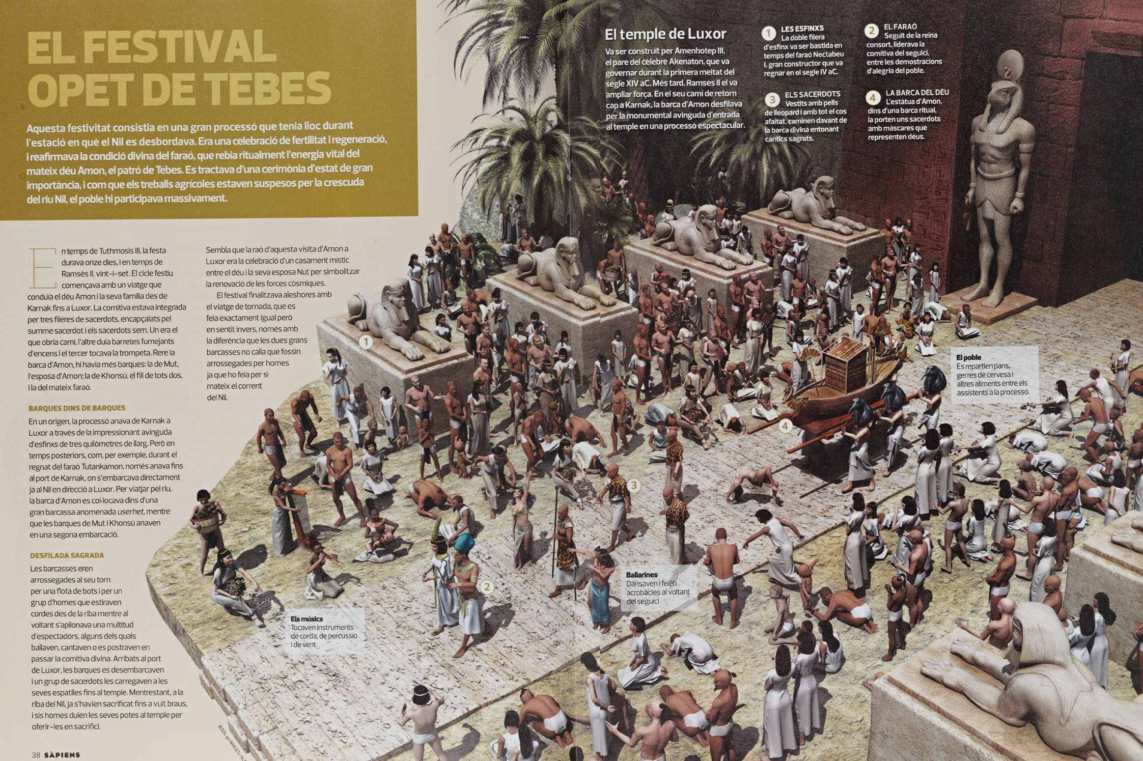 Originalmente titulada Fiestas religiosas en la Antigüedad, la infografía sirvió para ilustrar El festival Opet de Tebes (El festival Opet de Tebas) en un amplio reportaje titulado Ser sacerdot a l'antic Egipte (Ser sacerdote en el antiguo Egipto), publicado en Sàpiens. El festival Opet se celebraba en la ciudad de Tebas, durante la crecida anual del Nilo. La ceremonia central de la fiesta consistía en una procesión religiosa en la que se transportaban en barcas rituales las figuras del dios Amón y su familia, desde el santuario de Karnak al de Luxor. Era una ceremonia de Estado, en la que participaba el faraón y su familia, los altos dignatarios y la corte, los sacerdotes, los militares y el pueblo. El festival de Opet consagraba y conmemoraba la divinidad del soberano, como hijo de Amón. Los registros más antiguos de la celebración se remontan a la corregencia de la reina Hatshepsut y Tutmosis III, en la XVIII dinastía. La revista catalana Sàpiens, que se publica cada mes, se dedica a la divulgación histórica.