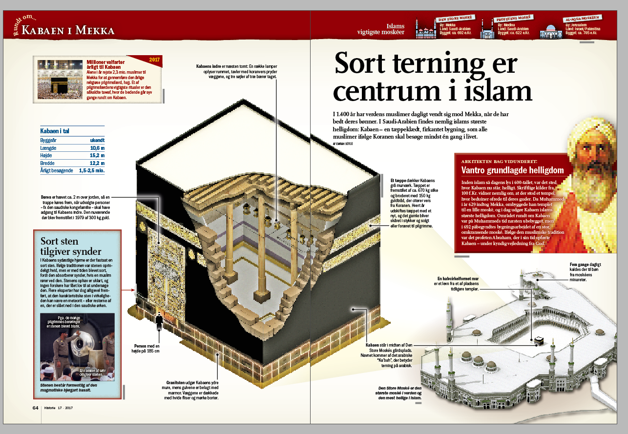 El recinto de la Kaaba, una construcción en forma de cubo que se encuentra en el gran patio interior de la mezquita Masyid al-Haram, en la Meca, la ciudad sagrada del islam, fue reproducido por el magazín de historia danés Illustreret Videnskab Historie en su sección habitual Rundt om… (A propósito de…). En el interior de la Kaaba se guarda una piedra negra (probablemente un meteorito), considerada una reliquia. Según el Corán, la Kaaba fue construida por Abraham y su hijo Ismael, padre del pueblo árabe y antecesor de Mahoma y de la fe musulmana.