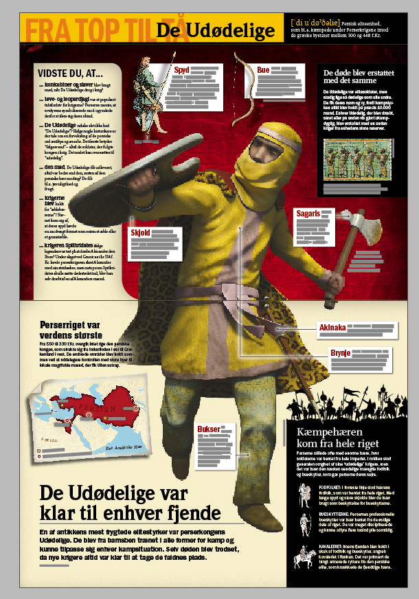 El ejército del imperio persa, el primero de la historia que abarcó territorios de tres continentes distintos, tuvo un cuerpo de elite: los Inmortales, que luchó en las guerras médicas y contra Alejandro Magno. Sus integrantes, seleccionados entre medos y persas, componían una unidad de 10.000 hombres, cuyo número jamás disminuía pese a las bajas en combate. De esa circunstancia se derivó su nombre. La publicación danesa de divulgación histórica Illustreret Videnskab Historie recurrió a varios elementos de la infografía Los Inmortales: soldados persas para elaborar el póster central de su sección Fra top til tå (De la cabeza a los pies), dedicada a soldados de todas las épocas y lugares.