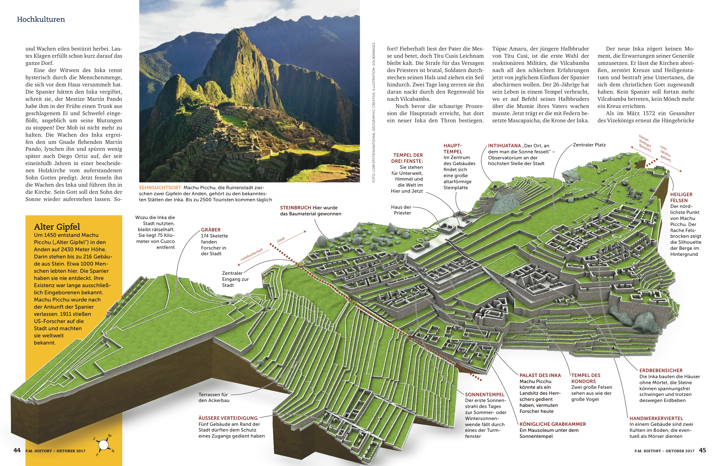 El magazín de historia alemán P.M. History eligió esta visión planimétrica de la ciudadela inca de Machu Picchu para ilustrar la civilización más avanzada del hemisferio sur. Construida en el siglo XV a 2.430 metros de altitud, entre cimas de la Cordillera Oriental de los Andes, en la región peruana de Cuzco, la "ciudad perdida de los incas" fue "redescubierta" por el profesor y explorador estadounidense Hiram Bingham en 1911. Machu Picchu (en quechua, "monte viejo"), considerada una obra maestra de la ingeniería y la arquitectura incas, forma parte del Patrimonio de la Humanidad desde 1983 y fue elegida como una de las Siete Maravillas del Mundo en 2007.