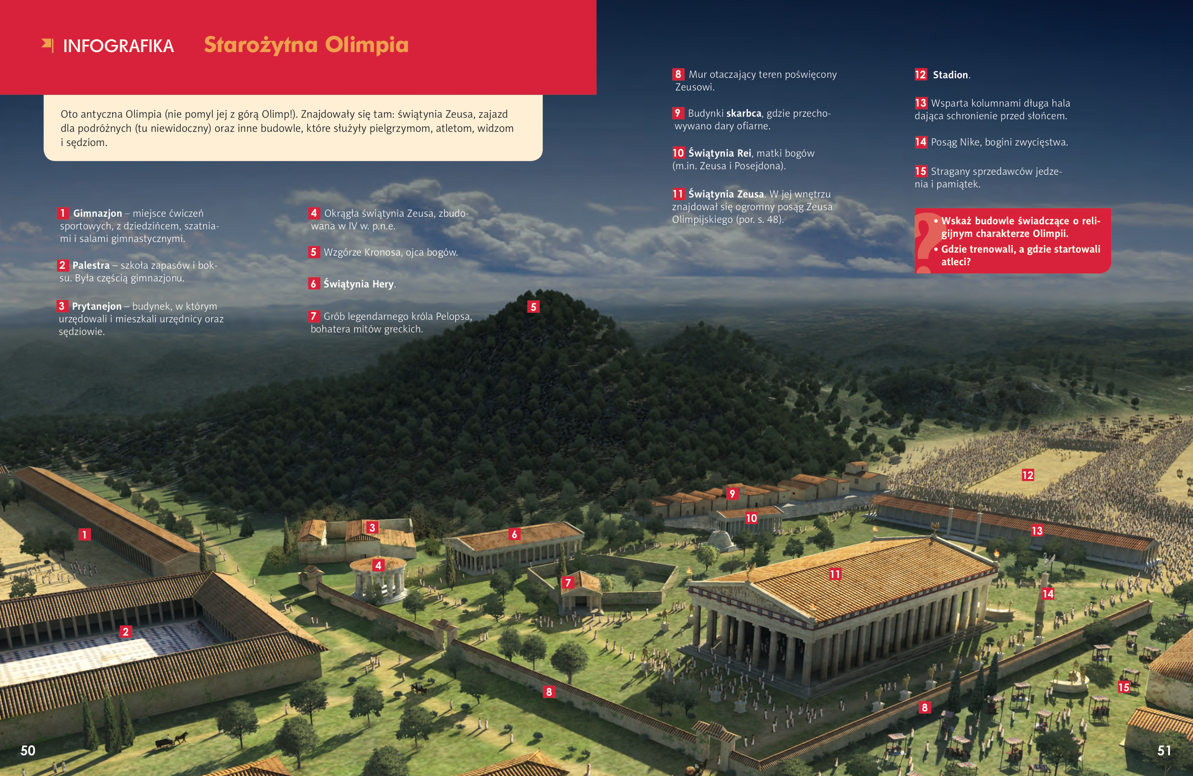 La ciudad de Olimpia, situada en la mitad occidental del Peloponeso, sede del mayor templo dedicado a Zeus y lugar donde los griegos celebraban cada cuatro años unos juegos atléticos en honor de los dioses, no podía faltar entre las infografías que Gdańskie Wydawnictwo Oświatowe incluyó en las páginas dedicadas a la Antigüedad. La infografía, titulada Starożytna Olimpia (La antigua Olimpia), forma parte de un manual de historia que abarca desde la Prehistoria hasta el final de la Edad Media.