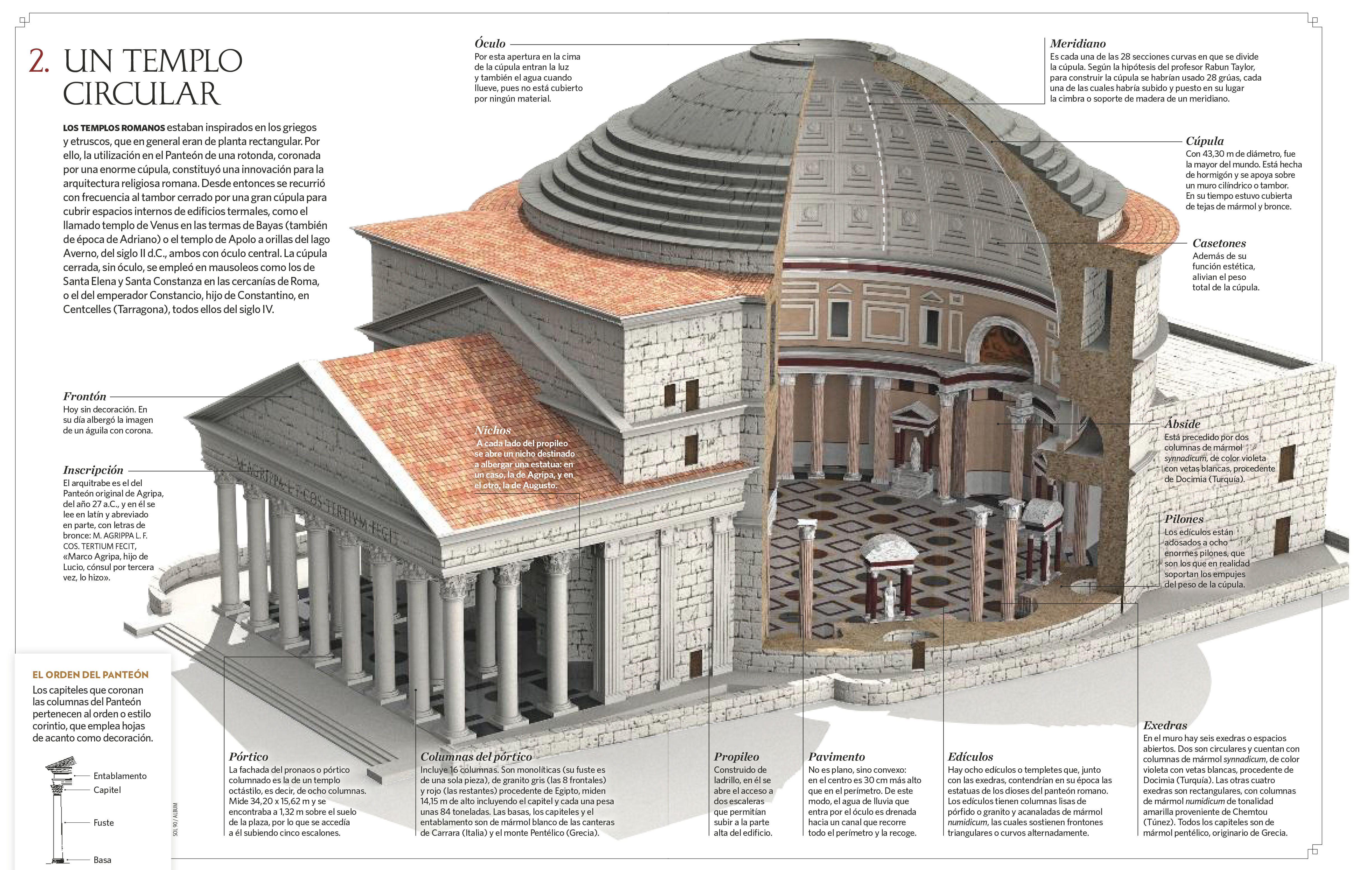 El Panteón de Agripa es una de los legados más fascinantes de la arquitectura de la antigua Roma. National Geographic Historia seleccionó la infografía Los templos romanos para mostrar la excepcionalidad de este edificio en el reportaje El Panteón de Roma. La última maravilla de la Antigüedad. Este singular templo cuenta con una de las cúpulas más majestuosas del mundo, cuyo diámetro y altura son de 43 metros. Su construcción fue proyectada y encargada por el general, político y arquitecto Marco Agripa (63-12 a. C.), durante el gobierno de su suegro y amigo el emperador Augusto (27-14 a. C.), y concluida en el año 126 d. C. por el emperador Adriano (76-138).