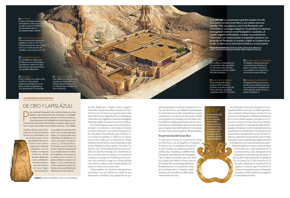 Fundada en 518 a. C. por el rey Darío I (549-486 a. C.), Persépolis fue la capital de los persas hasta su conquista por Alejandro Magno en 331 a. C. National Geographic Historia se ocupó de esta monumental ciudad en el reportaje titulado Persépolis. La fastuosa corte de los reyes persas, e incluyó la infografía que reconstruye la espléndida ciudad de la dinastía aqueménida. Tanto por su ubicación, en una terraza del monte Kuh-e Rahmat, en la actual provincia de Fars, como por sus dimensiones, su estructura y la magnificencia de su monumental arquitectura, basada en modelos mesopotámicos, Persépolis no tiene parangón entre las capitales de la Antigüedad. Fue una ciudad palacial, dedicada a grandes ceremonias religiosas y de Estado, y a impresionar a las legaciones extranjeras, aunque existe controversia en torno a sus funciones. La Apadana, la Tachara, la sala de las 32 columnas y los palacios del Tesoro y de las Cien Columnas son algunas de las construcciones más conocidas de este conjunto monumental único, obra de Darío I y sus sucesores, Jerjes I y Artajerjes I. En las inmediaciones, excavadas en la roca de Kuh-e Rahmat, en el sitio llamado Naqsh-e Rostam, se encuentran las tumbas de varios soberanos de la dinastía aqueménida. La Unesco declaró a Persépolis Patrimonio de la Humanidad en 1979.