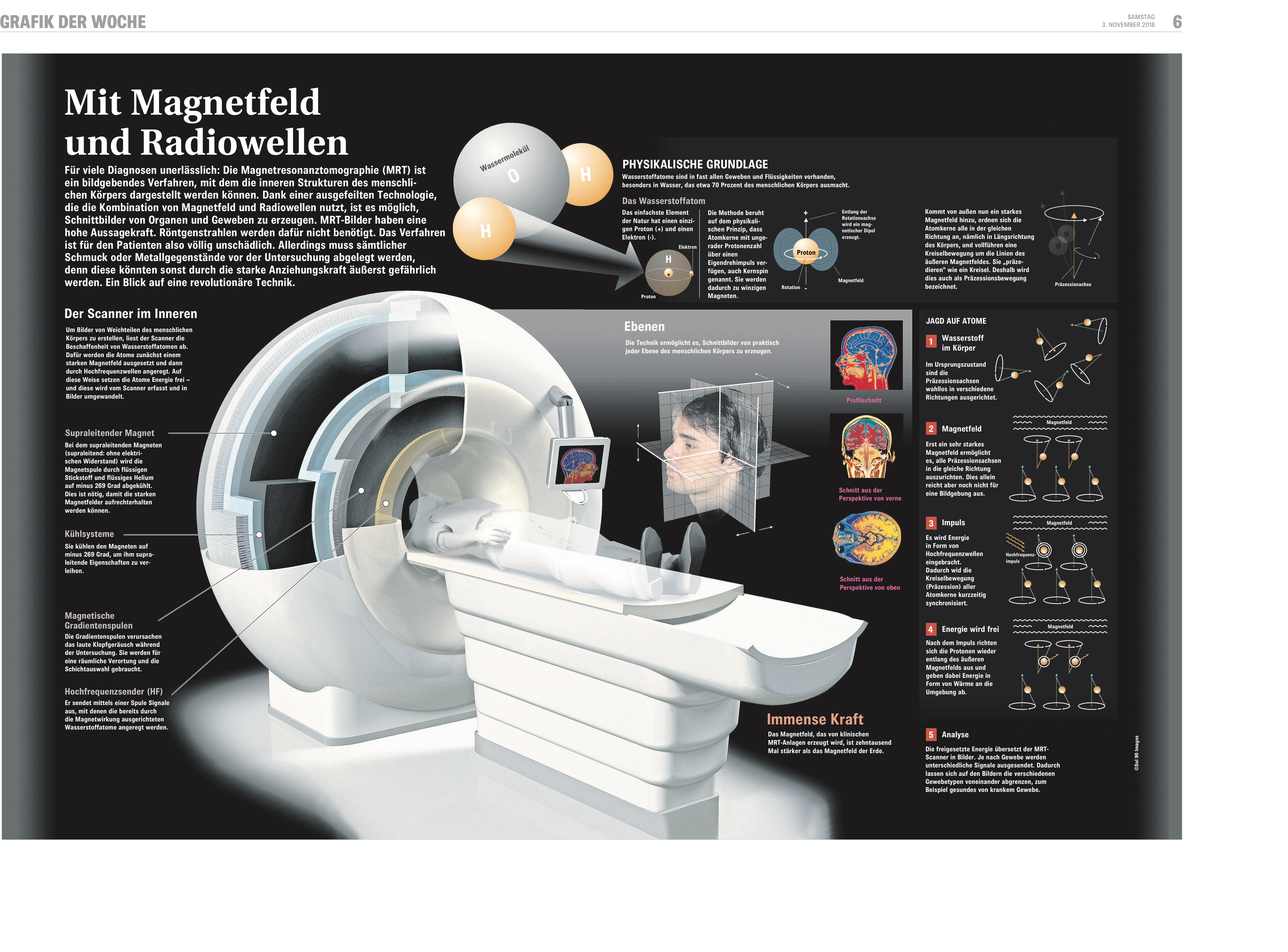 La resonancia magnética, un potente auxiliar diagnóstico por la imagen, protagonizó la sección Grafik der Woche (Infografía de la semana) del suplemento sabatino del periódico alemán Mannheimer Morgen. El diario reprodujo la infografía sin añadir ni sustraer imágenes del formato original. La presentó bajo el título de Mit Magnetefeld und Radiowellen (Con campos magnéticos y ondas de radio).