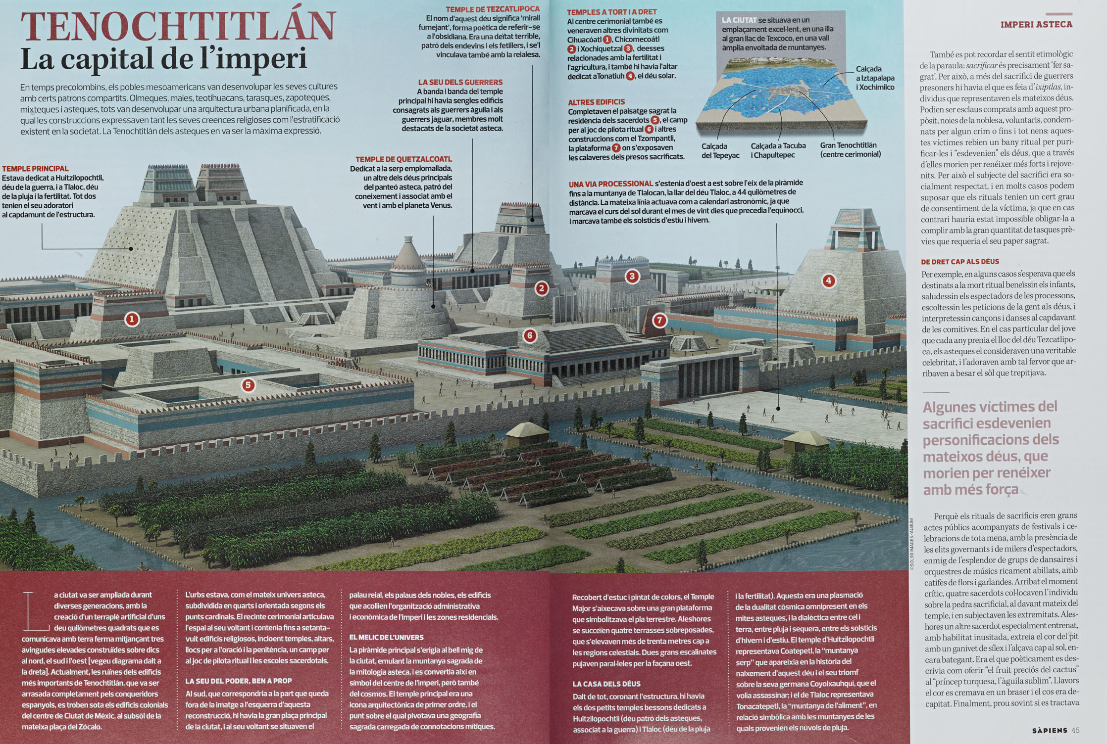 Tenochtitlán, la capital del Imperio azteca, ilustró un reportaje titulado Sang per als déus (Sangre para los dioses), publicado en Sàpiens, la revista de divulgación histórica escrita en catalán. La información versaba sobre las prácticas del sacrificio humano que llevaban a cabo los aztecas. De cultura y lengua nahuas, el azteca era un pueblo de agricultores, comerciantes y guerreros. Asentados en las pantanosas tierras del Valle de México, levantaron, entre los siglos XIV y XVI, un imperio en Mesoamérica que se extendió por el centro del actual estado mexicano y alcanzó las costas del Golfo y del Pacífico.